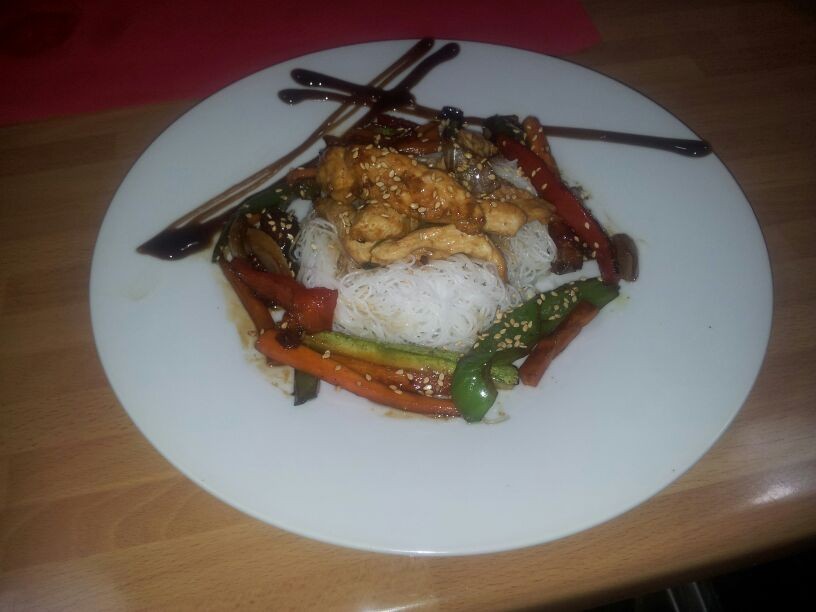 Salteado de verduras con fideos de arroz y pollo