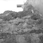 c) A continuación unos 7 metros de muralla enlucida en cemento de unos 2 metros de altura, no llega hasta el final de la calle y según tradición oral a partir de esta esquina existía una salida desde el castillo hacia la Plaza de la Constitución: sobre una base cuadrangular de tapial forrada de mampostería seguían en talud dos plataformas, no muy altas ni anchas, de sillares de caliza en forma de pico o triangular (que podrían estar haciendo alusión a la cimentación y primeros niveles de una torre cuadrangular y la compactación, nivelación y adecuación del terreno para recibirla, ¿la torre del homenaje?).
