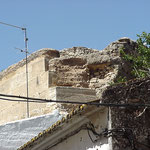 -Casa nº 3 de la Plaza de la Conatituci6n. A lo largo de toda la casa y en el lado derecho transcurren 45 metros de cantera entre los 3 metros y medio por el final de la casa hasta los casi 4 metros por la entrada de la casa. En el cuerpo superior de 1a casa aparecen unos 8 metros de muralla de tierra de escasa altura y que está incluida en la pared lateral, bastante imprecisa de apreciar por la obra actual realizada, aunque parece que parte pudiera ser de piedra o sillares y de tierra. Le sigue un tramo de unos 2 metros en que la cantera es muy baja (no alcanzando los 2 metros sobre el nivel de la casa) y sin presentar señales de muralla. A continuación sobre 3 metros y medio de cantera según el nivel del suelo actual se levanta un lienzo de muralla entre 4 y 5 metros de altitud, del cual unos 2 metros están realizados en piedra caliza, varias hiladas en sillares cuadrangulares de apariencia romana (sin presentar la disposición de soga y tizón típicas islámica de la zona) y sobre ellos, unas hiladas en bloques pétreos rectangulares pequeños (sillarejo) e características similares a las observadas en la torre cuadrangular norte del castillo de Toledillo; sobre ésta última estructura se levantan de 2 a3 metros de muralla en tapial (según desgaste), de tierra compactada y piedras muy pequeñas. Este tramo presenta un ángulo hacia dentro sobre su mitad en el lado izdo. Desde este lugar también es posible observar la esquina que hace con el tramo de muralla del lado dcho. del recinto antes descrito.