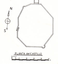 La planta del castillo es un eneágono irregular con una superficie aproximada de 3.104 metros cuadrados, y una torre de sección cuadrada adosada a la cortina Norte de 49 metros cuadrados de superficie. El adjunto plano se ha confeccionado situando los afloramientos de cortinas y torres que se observan desde el exterior de la planta, pues el nivel del terreno interiormente es algo superior y oculta estos afloramientos. Los materiales empleados en la construcción son sillares cúbicos de 38 centímetros de arista, mampuesto y tierra apisonada.