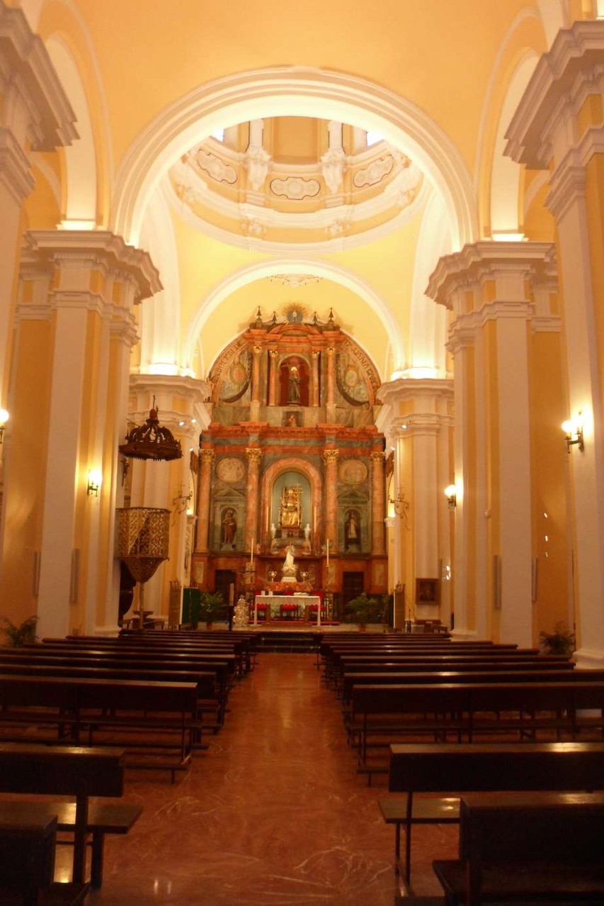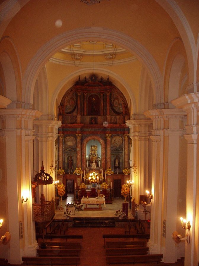 Consta de tres naves de cañón compartimentadas por arcos de medio punto que apean sobre pilares a los que adosan pilastras toscanas. Las naves son cubiertas con bóvedas baídas; con bóvedas semiesféricas sobre pechinas se cubren las capillas de cabecera.