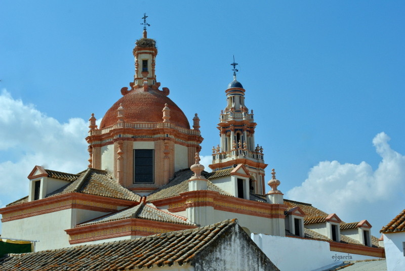 Presenta dos portadas situadas en las fachadas norte y sur, y la torre en el ángulo suroeste, de cuatro cuerpos y manifiesta influencia ecijana en su decoración, resaltando la labor de azulejos.