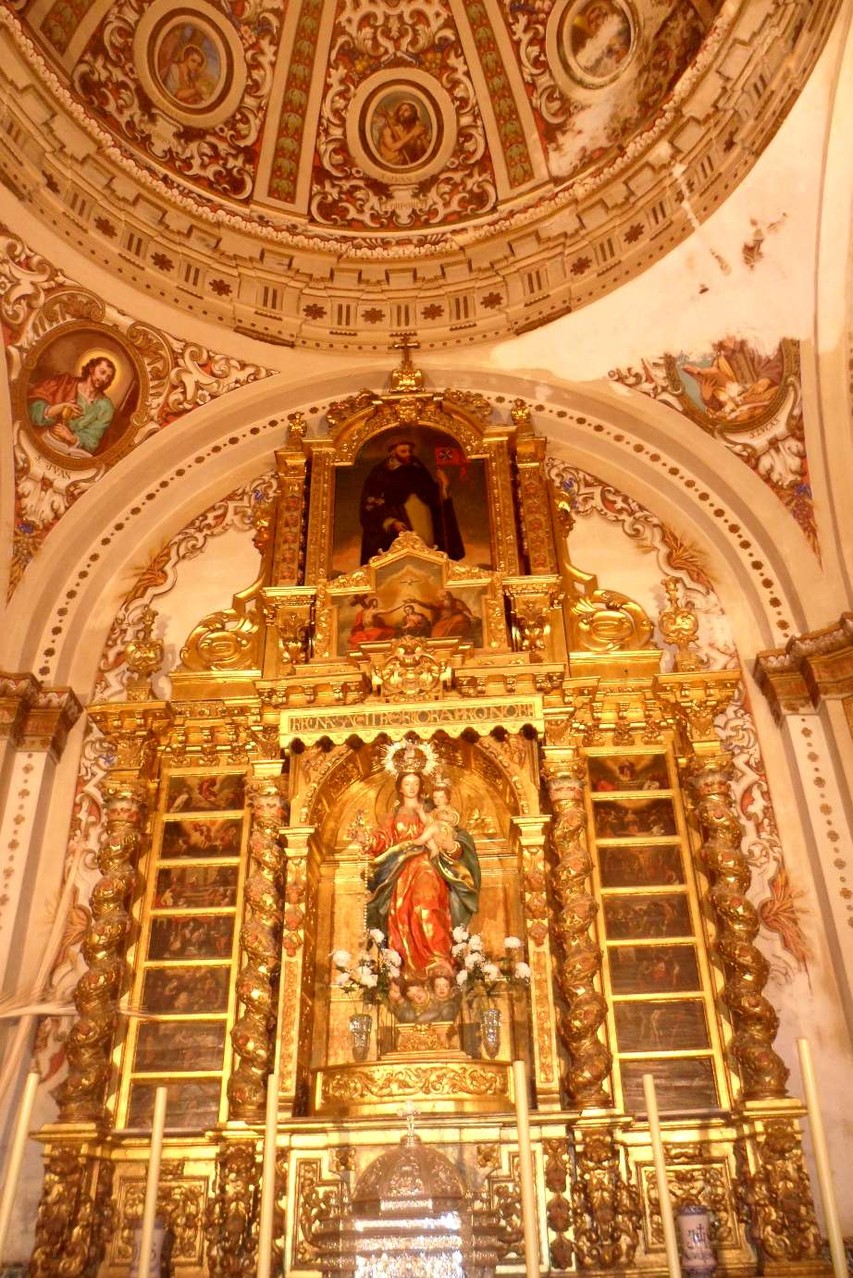 En las calles laterales aparecen catorce tablas con los Misterios del Rosario, que al principio estarían en el intradós del camarín.