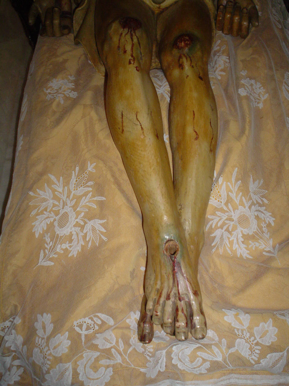 El cuerpo del Señor presenta una complexión anatómica fuerte, faltándole los hombros debido al sistema de articulación de los brazos, con un gran desgarro en el costado derecho debido a la lanzada de Longinos y los huecos de los clavos en las palmas de las manos y en los pies. Tres grandes regueros de sangre corren por los brazos y el costado derecho; gruesas gotas surgen de las heridas de la corona de espinas, los hombros, el cuello y las rodillas.
