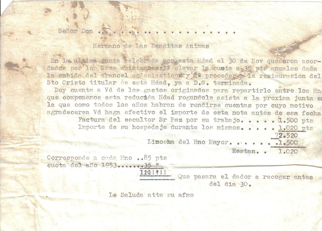 [4] Inédito. Archivo Hadad de Ánimas Benditas del Purgatorio de Peñaflor. Recibos y facturas sigo XX, octubre de 1960.